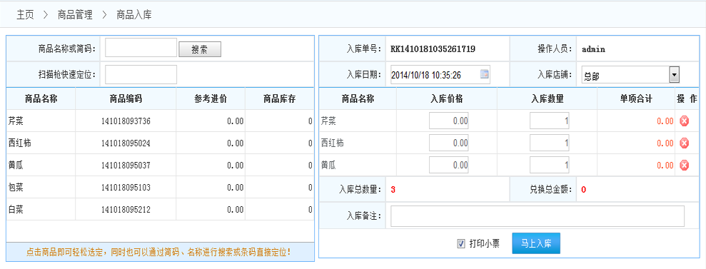 商品入庫:點(diǎn)擊進(jìn)入商品入庫界面 如下圖: