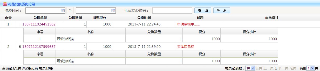 消費(fèi)記錄: 1.查詢:可以根據(jù)兌換單號 時(shí)間段 等條件查詢 2.導(dǎo)出:可以將按條件查詢出來的數(shù)據(jù),以Excel表格形式導(dǎo)出 3.列表:雙擊兌換單號,可以查看消費(fèi)詳情 (見下圖)