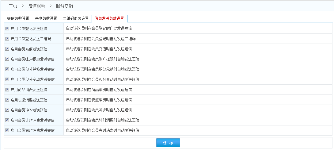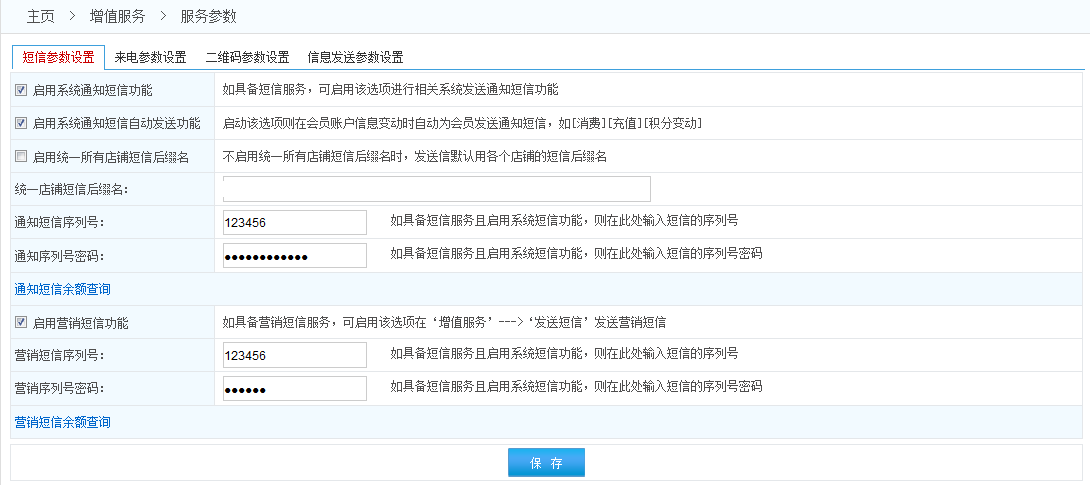 2.通知短信是會(huì)員在本系統(tǒng)中進(jìn)行消費(fèi)充值等操作時(shí)給會(huì)員發(fā)的提醒短信;營銷短信是為了促銷等目的專門為一個(gè)或多個(gè)會(huì)員發(fā)送的(營銷短信有且只能在發(fā)送短信的頁面發(fā)送)