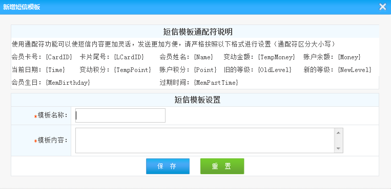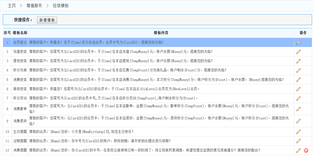 系統(tǒng)模版:    一到十一為系統(tǒng)內(nèi)置模板只可以修改不可以刪除(包含積分變動、等級短信、消費短信、積分兌換、提現(xiàn)短信、充值短信、會員登記;)十二以后為用戶自定義短信模板,可編寫,可刪除
